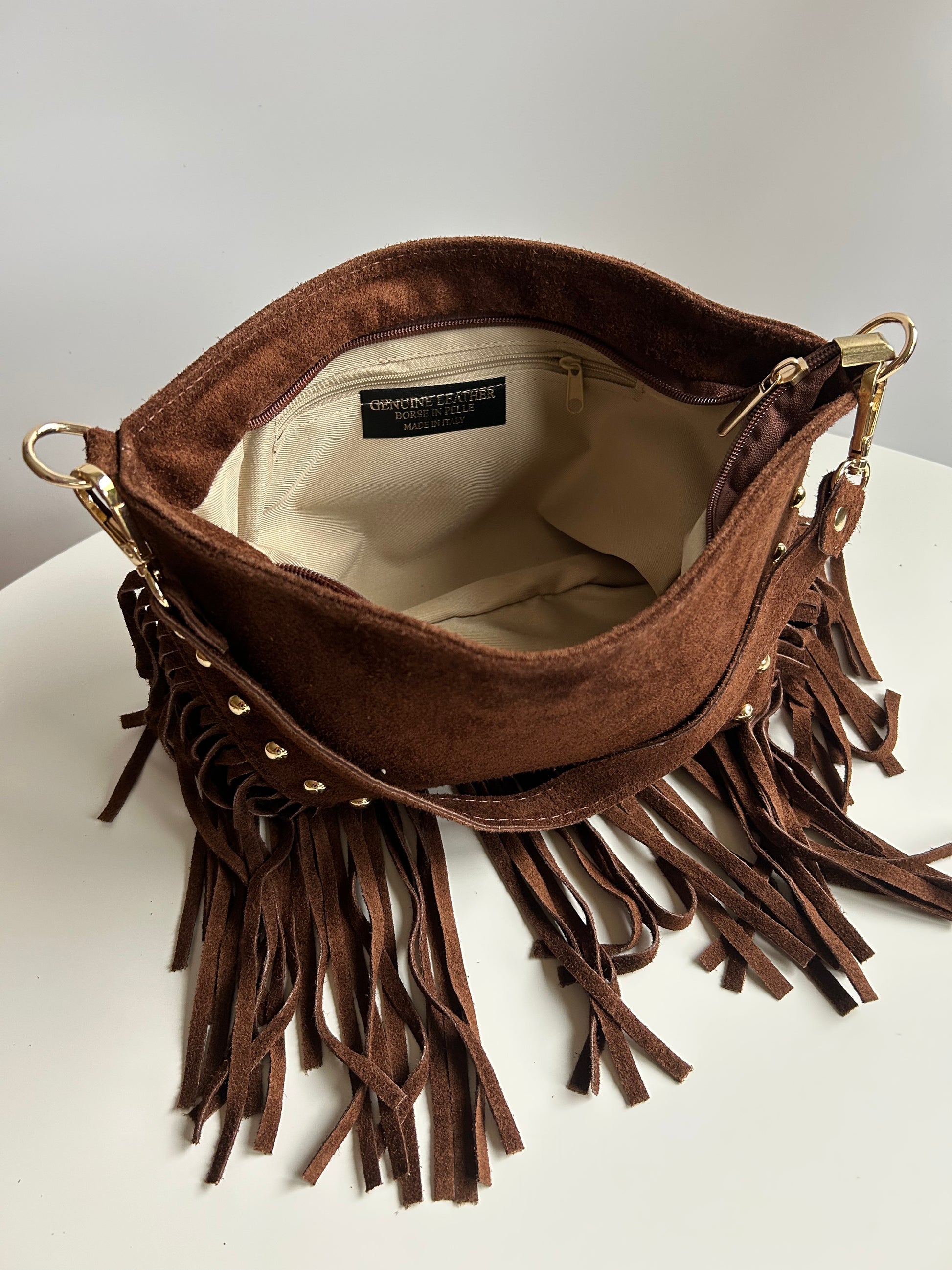 Realizzata in vera pelle scamosciata italiana, la borsa HANA unisce morbidezza e praticità.