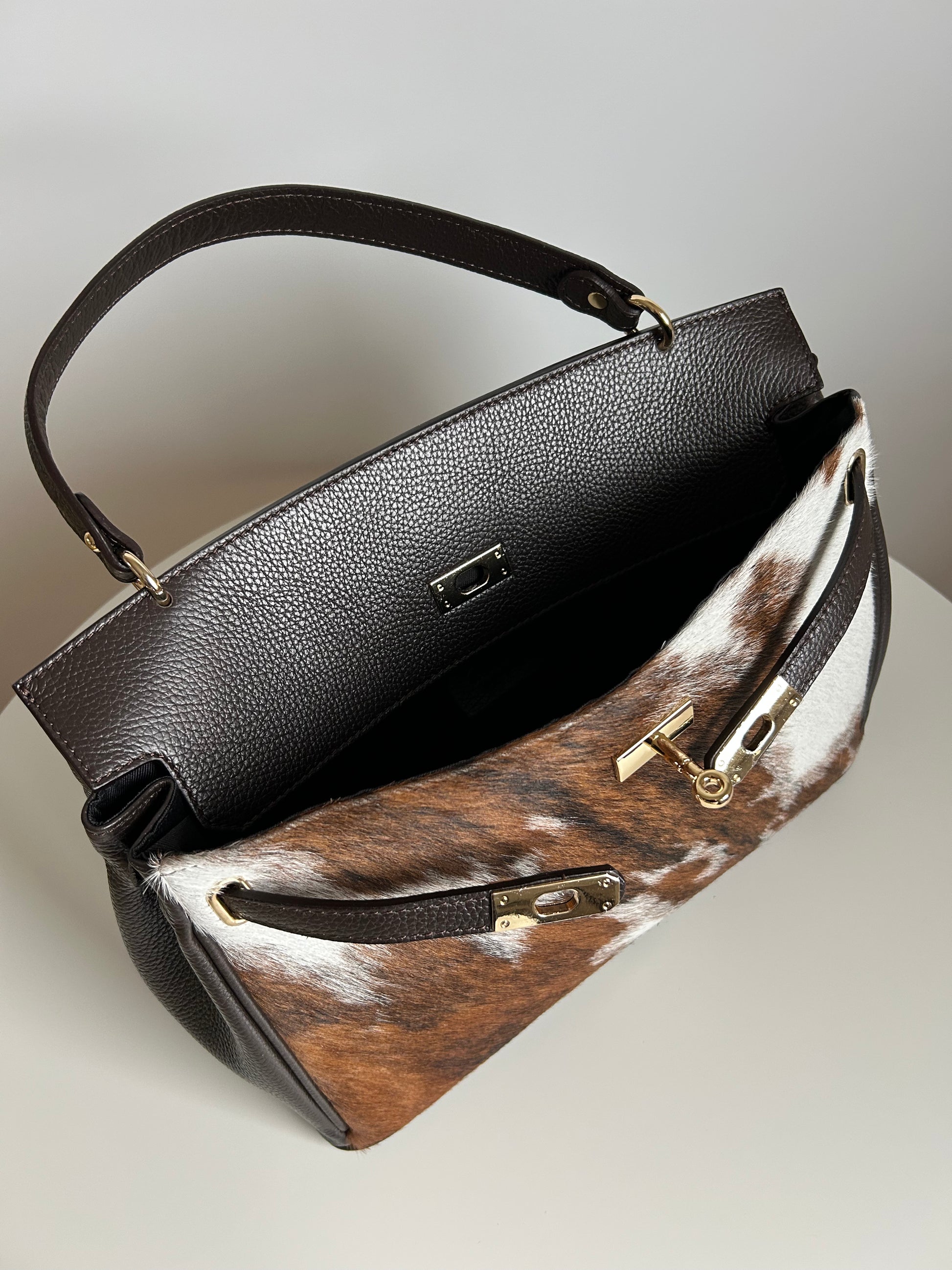 Borsa realizzata in vera pelle e cavallino, Made in Italy. Tracolla regolabile in pelle compressa, due tasche interne. Perfetta per chi cerca funzionalità senza rinunciare all'eleganza.
