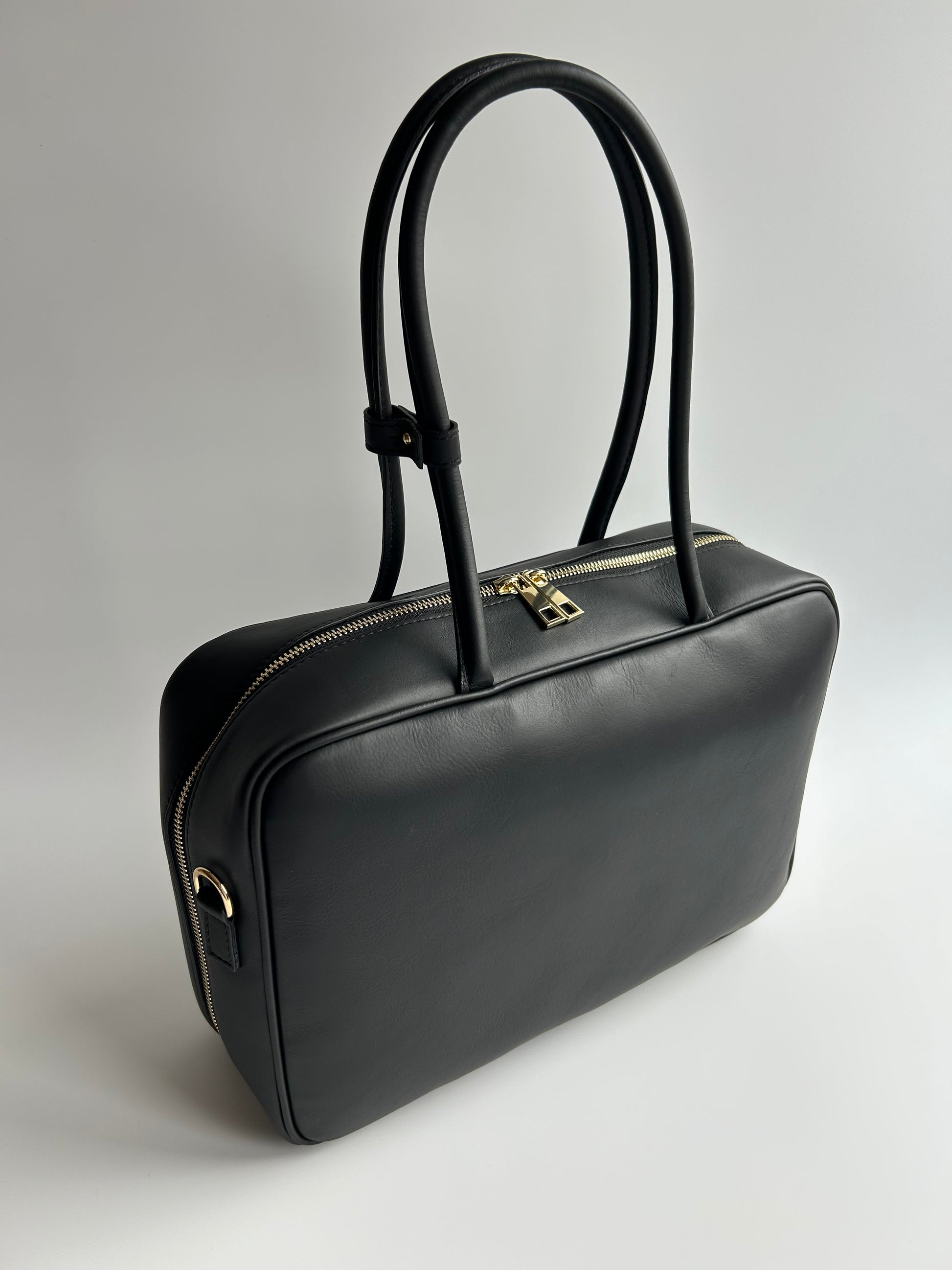 Doppio manico da portare a spalla, a mano e tracolla regolabile.Piedini protettivi e chiusura a cerniera.