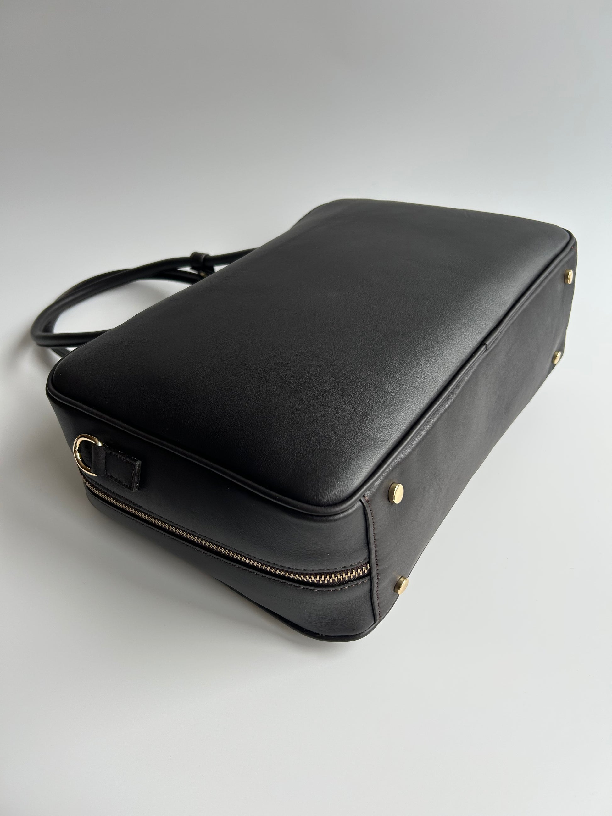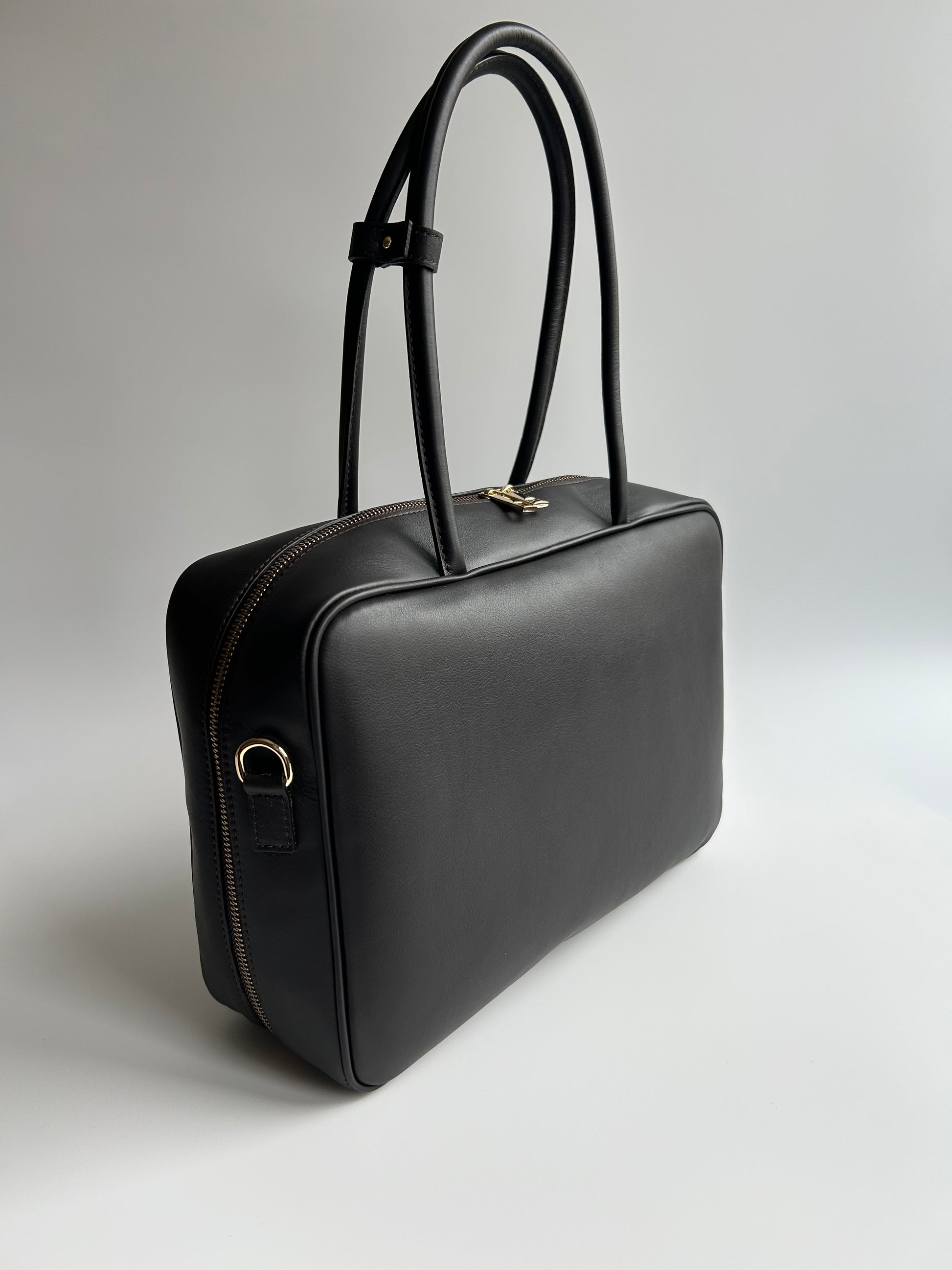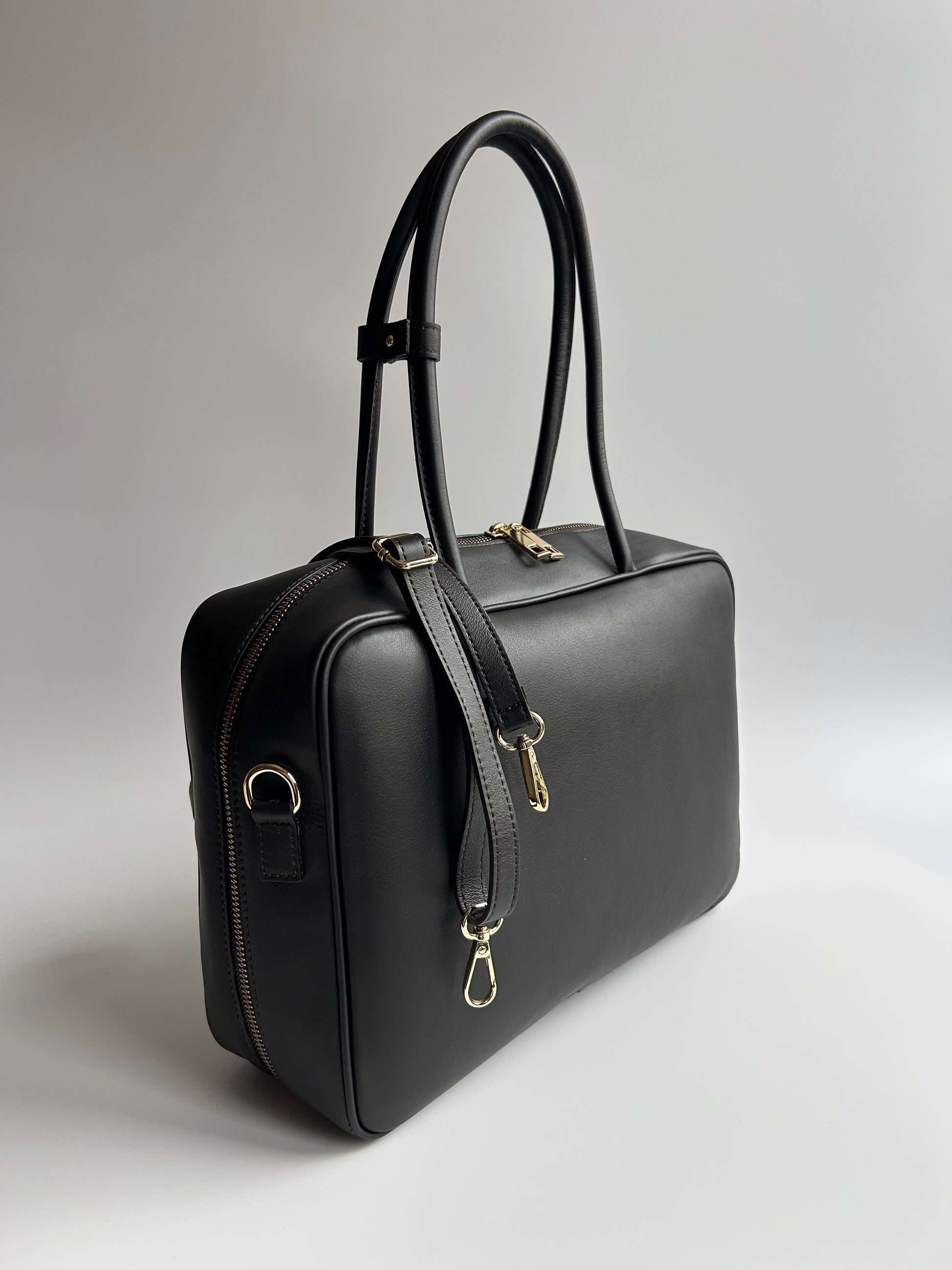 Doppio manico da portare a spalla, a mano e tracolla regolabile. Piedini protettivi e chiusura a cerniera.